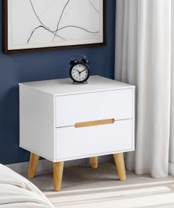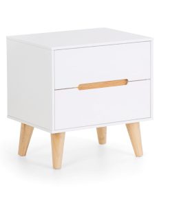 A stylish, retro-inspired bedside cabinet with two drawers in an immaculate matt white lacquered finish, with complementary tapered oak finish legs and recessed handles to provide easy opening. The sleek Scandinavian feel fits beautifully with any décor.