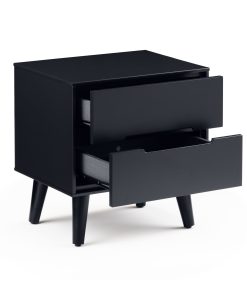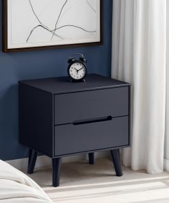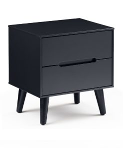 A stylish, retro-inspired bedside cabinet with two drawers in an immaculate matt anthracite lacquered finish, with complementary tapered oak finish legs and recessed handles to provide easy opening. The sleek Scandinavian feel fits beautifully with any décor.