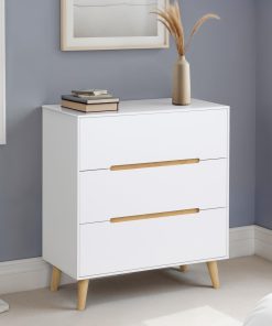A stylish, retro-inspired chest with three large drawers in an immaculate matt white lacquered finish, with complementary tapered oak finish legs and recessed handles to provide easy opening. The sleek Scandinavian feel fits beautifully with any décor.