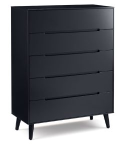 A stylish, retro-inspired chest with five large drawers in an immaculate matt anthracite lacquered finish, with complementary tapered oak finish legs and recessed handles to provide easy opening. The sleek Scandinavian feel fits beautifully with any décor.