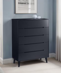 A stylish, retro-inspired chest with five large drawers in an immaculate matt anthracite lacquered finish, with complementary tapered oak finish legs and recessed handles to provide easy opening. The sleek Scandinavian feel fits beautifully with any décor.