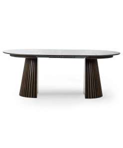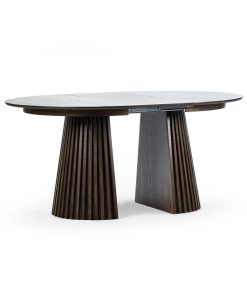 Discover the ultimate dining experience with the Arya Extending Dining Table – a masterpiece of modern design infused with Japandi elegance. Crafted from rich dark oak MDF veneer, it transforms effortlessly from a striking circular shape with a ribbed, coned base to an elongated oval with dual supports, combining sophistication and functionality.