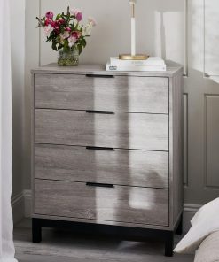 Using revolutionary click furniture technology, the Bali collection combines high quality style with simple assembly. With a modern grey oak finish and contrasting black legs and handles, the Bali collection creates a classic industrial look in your bedroom – leaving you with a high-quality interior, with low maintenance upkeep. This collection includes: 1 drawer bedside, 2 drawer bedside, 4 drawer chest, 6 drawer wide chest, dressing table/desk, wardrobe, and bookcase bed.