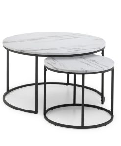 The Bellini Round Nesting Coffee Table ensures long lasting durability, crafted from black coated metal and MDF in an white marble foil finish. This set of two coffee tables boast a contemporary, stylish design with an industrial feel. Ensuring a space saving solution, the coffee tables slot together as and when they are in use.