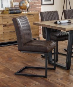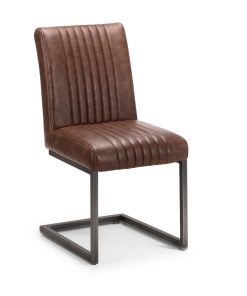 The Brooklyn Dining Chair has an industrial, retro design in a vintage brown faux leather finish with a cantilever style gunmetal leg frame.