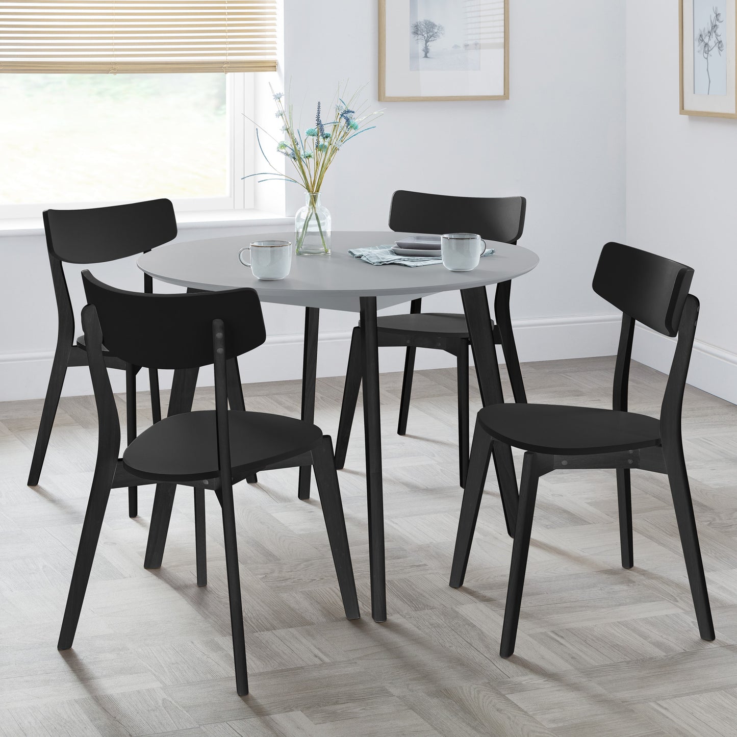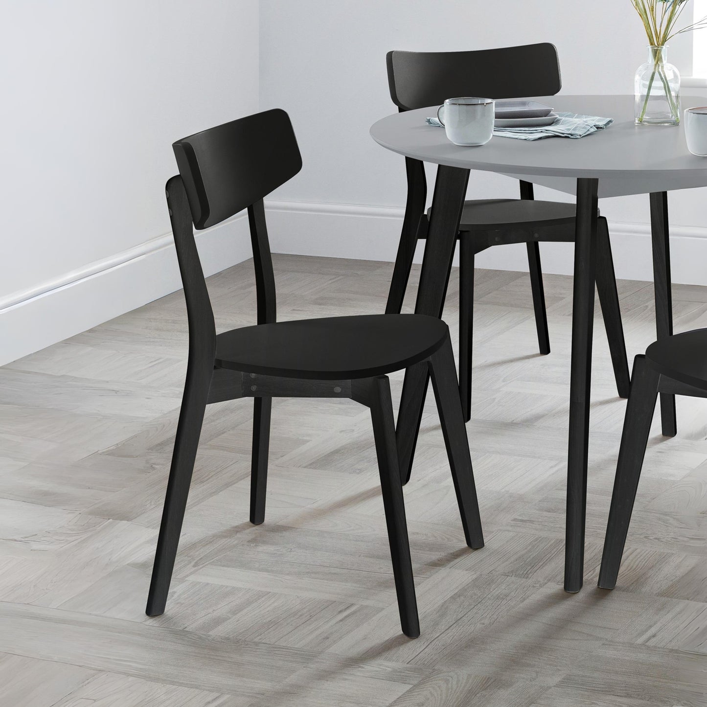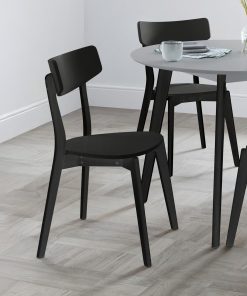 Add understated elegance to your dining space with this set of 2 chairs, finished in sleek black with a gently curved back panel and matching legs for a modern, cohesive look. Featuring clean lines and a versatile design, they suit a variety of interiors, while the solid hardwood frames provide lasting strength and stability. The smooth seat ensures comfortable everyday seating, making them a practical and stylish choice for any dining area.