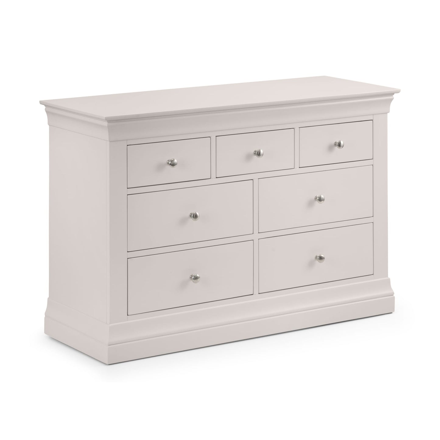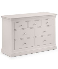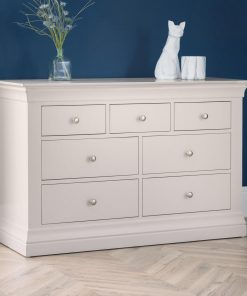 The Clermont Bedroom Collection is finished in a striking light grey lacquered finish, with simple clear lines that add a feeling of light and space. Crafted from Pine and MDF, featuring brushed steel handles, this elegant French inspired design is suitable for both contemporary and traditional settings. The Clermont 4+3 Drawer Chest offers 3 small and 4 large drawers, perfect for storing your clothing.
