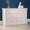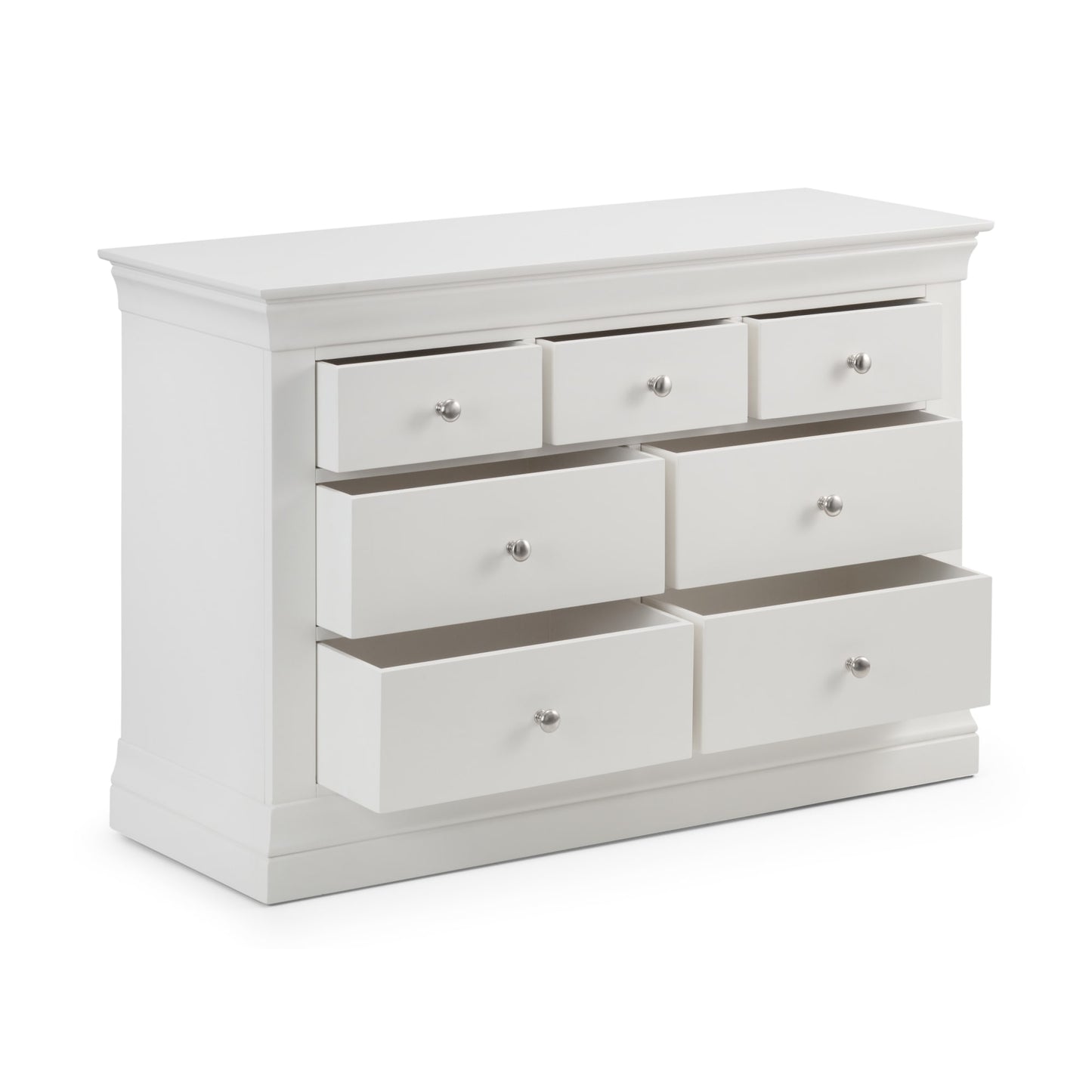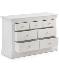 The Clermont Bedroom Collection is finished in a striking white lacquered finish, with simple clear lines that add a feeling of light and space. Crafted from Pine and MDF, featuring brushed steel handles, this elegant French inspired design is suitable for both contemporary and traditional settings. The Clermont 4+3 Drawer Chest offers 3 small and 4 large drawers, perfect for storing your clothing.