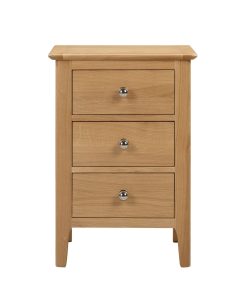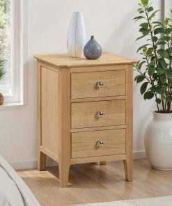 Crafted from solid oak and oak veneers, the Cotswold 3 Drawer Bedside ensures lasting durability with its robust structure. Featuring 3 spacious drawers, ideal for keeping night-time necessities within arm’s reach, with additional space on top for a bedside lamp. This simple, yet elegant design is finished with a round silver knob, perfect for any traditional bedroom.