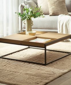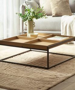 Add style and functionality to your living room space with this contemporary square tray coffee table. Finished in warm light oak effect, it features four removable tray-top covers. It features four removable tray-top covers. Each tray can be used flat as a standard coffee table surface, flipped to create a raised-edge tray, or lifted away completely to double as a serving tray for drinks, snacks, or even breakfast on the sofa. The slim black metal legs provide sturdy support while adding a sleek, modern contrast to the natural wood tones. Partial assembly required, just attach feet.