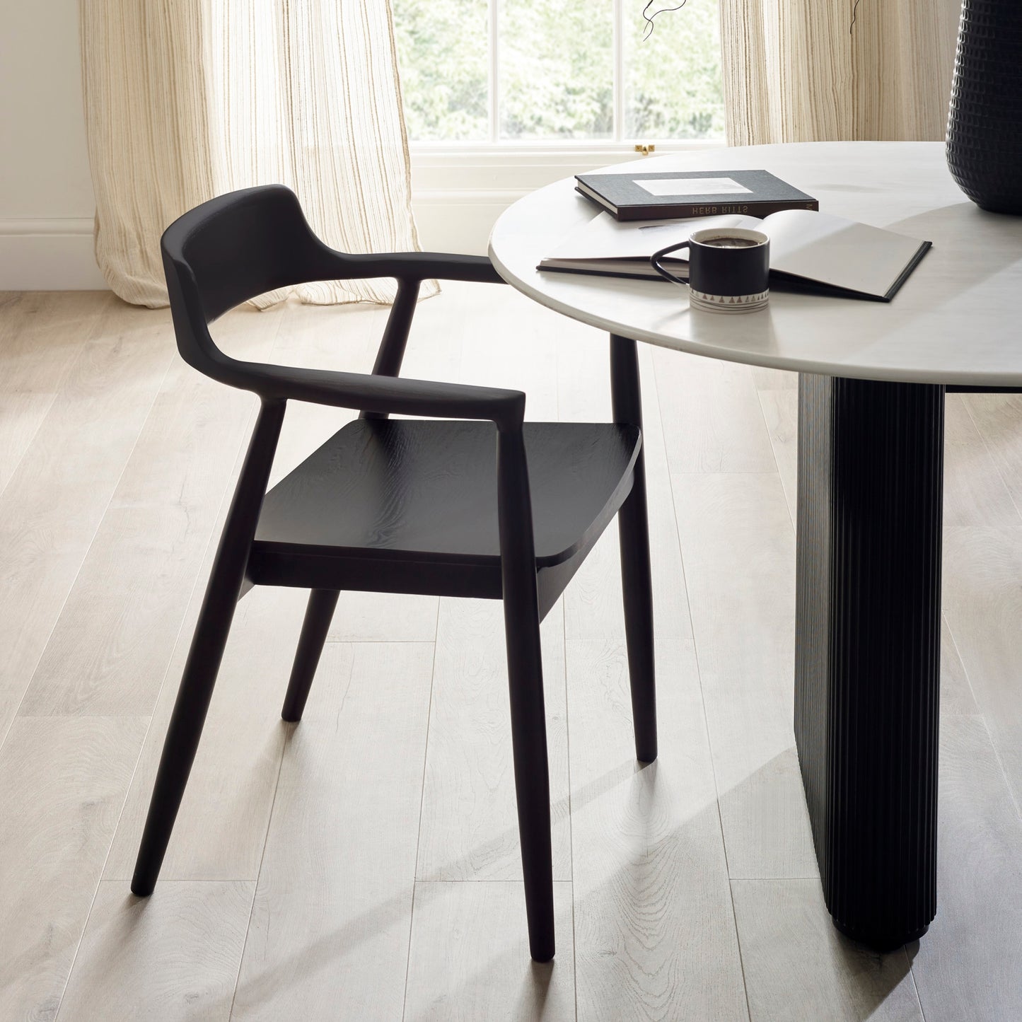 Elevate your dining space with a chair that’s as comfortable as it is stylish. This modern black dining chair with arms combines clean contemporary lines with a sculptural silhouette, creating an effortlessly refined look for kitchens, dining rooms, and work-from-home spaces.