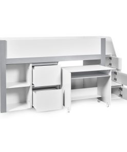 Make the most of your child’s space with this functional and stylish mid sleeper bed, designed to support sleep, study, and storage all in one compact footprint. Finished in a sleek white and silver colourway, this contemporary midsleeper bed fits seamlessly into modern kids’ bedrooms. It features a pull-out desk on smooth castors, integrated drawers, and open shelving compartments—perfect for keeping books, toys, and school supplies neatly stored. The fixed ladder includes hidden cupboard storage, offering additional convenience without taking up extra room. Built from durable wood, it’s a smart, long-lasting solution for growing families. Mattress sold separately.