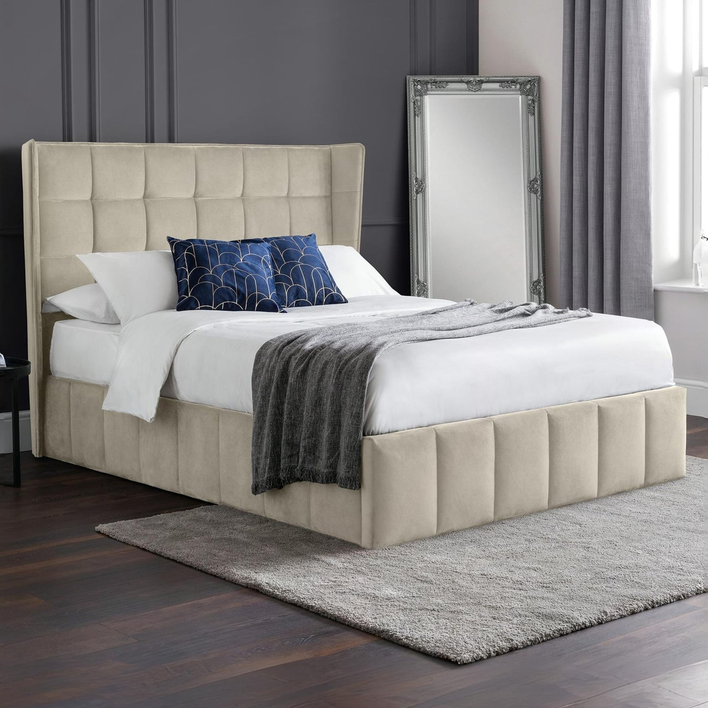 Indulge in timeless elegance with this Gatsby ottoman bed, designed to bring sophistication and luxury to your bedroom. Upholstered in a soft-touch cream velvet, this statement bed features a tall, winged headboard that blends classic design with modern flair. The smooth velvet finish adds a plush, inviting texture, while the deep ottoman storage base lifts with ease—ideal for keeping extra bedding, pillows, or out-of-season clothes neatly tucked away. Perfect for those who value both form and function, this bed transforms your sleeping space into a serene sanctuary.