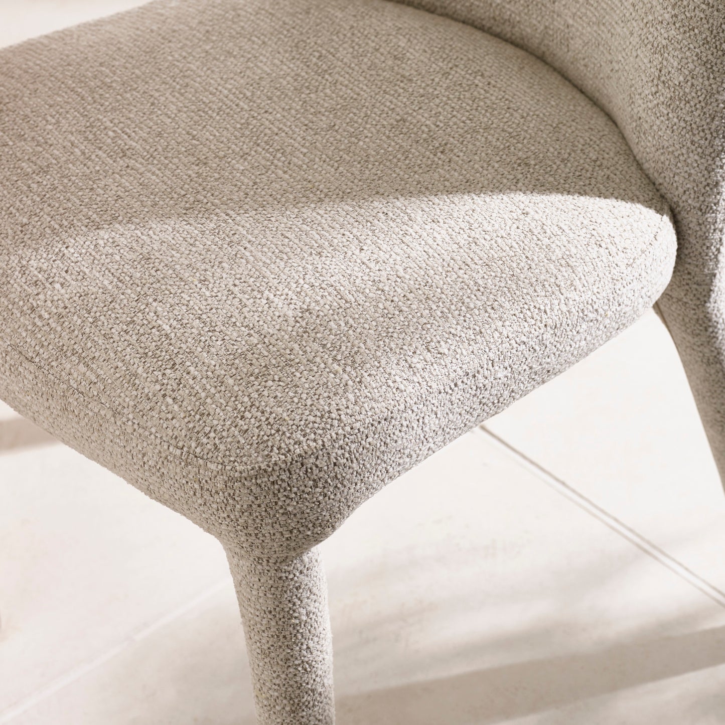Bring soft sophistication to your dining space with this elegant chenille upholstered dining chair. Wrapped in pearl sand, beige, chenille fabric, its smooth curves, foam-padded seat, and subtly rounded back provide both comfort and style. The fully upholstered legs maintain a seamless, contemporary look, making it a versatile choice for modern dining rooms, kitchens, or breakfast nooks. Its effortless design adds understated luxury without the need for assembly.