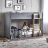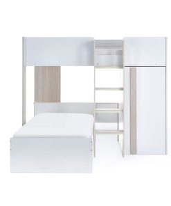 Enter the enchanting world of the Horizon Bunk in a pale woodgrain and white finish, a versatile and delightful sleeping solution crafted especially for your little ones. Beyond offering a good night’s sleep, this bunk bed is an adventure waiting to unfold! What truly sets it apart is its innovative design, allowing the bed below to easily transform into alternate positions, adapting to the evolving needs of your little adventurer. The built-in wardrobe and shelving surrounding the inside of the lower bunk offer ample space for storage and display, encouraging organisation and creativity. Bedtime transforms into a joyful adventure with their favorite toys, books, and treasures always within arm’s reach. As the night falls, the glow-in-the-dark steps add an extra touch of magic, guiding sleepy little feet safely to the top bunk.