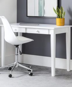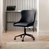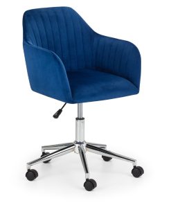 Finished in soft velvet, the Kahlo swivel office chair features a filled seat with a curved backrest, giving a beautiful look as well as maximum comfort. The height adjustable gas lift mechanism and wheeled swivel base provides practicality, whilst the pleated back adds to the traditional art deco design. Available in two beautiful colour options of blue or grey.