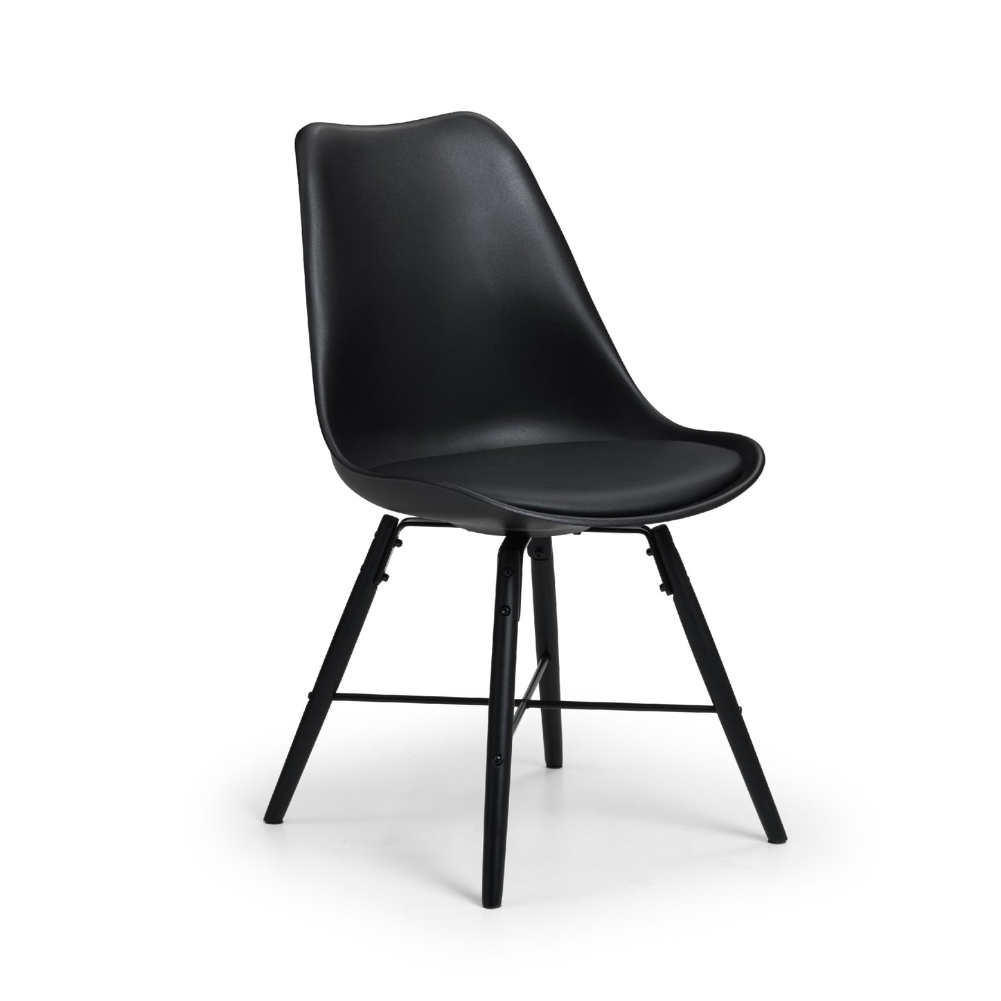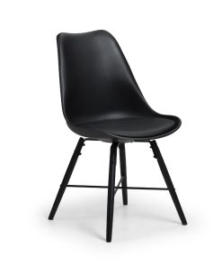 The Kari Dining Chair features a curved design that conforms to the natural curve of the spine, paired with a high-quality padded seat allowing you to reach maximum comfort. Featuring a black, easily-cleaned seat and black legs, with an steel cross bar giving this chair a modern industrial feel.