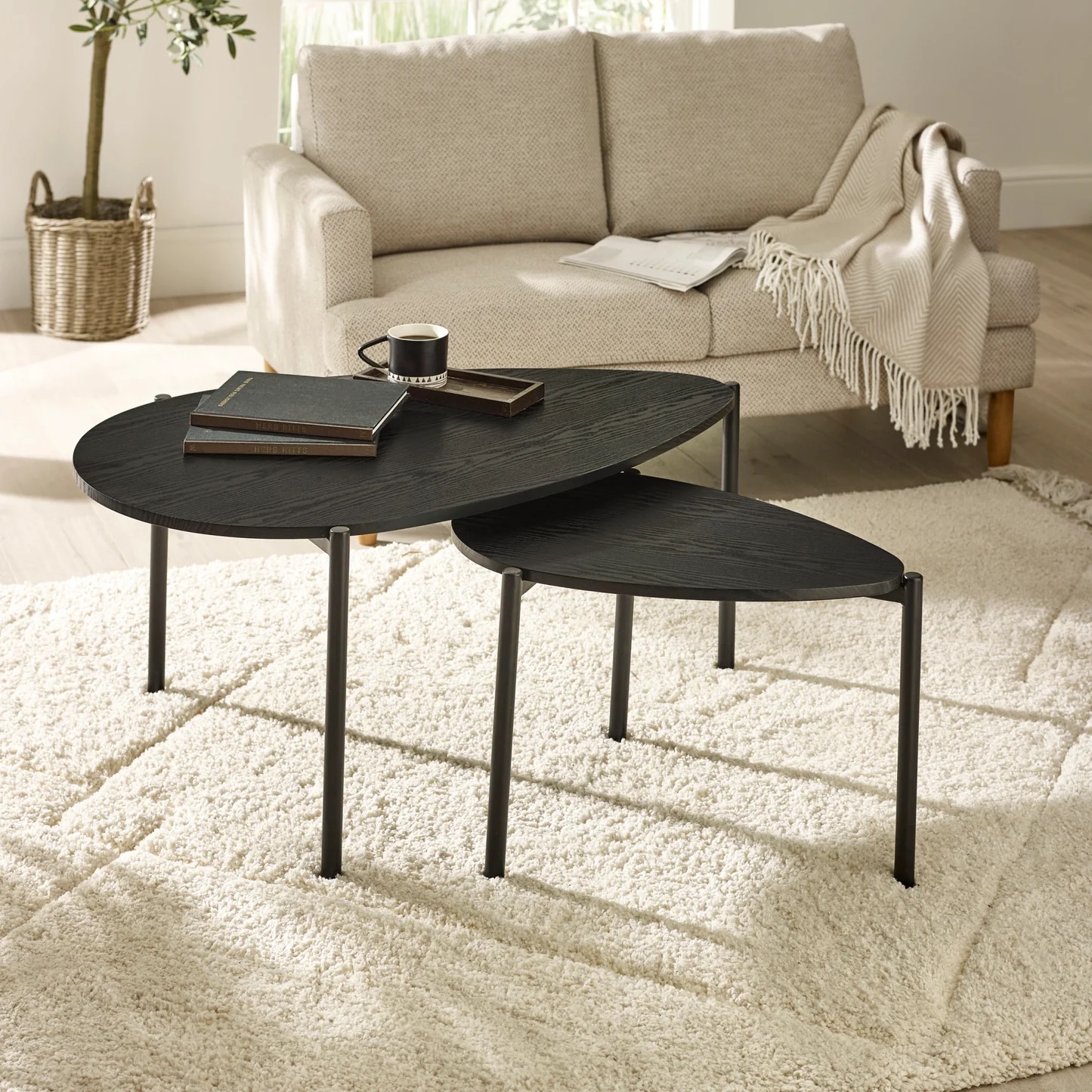 The Lorette Black Ash effect Coffee Tables bring sculptural simplicity and contemporary contrast to your living space. Featuring softly organic, overlapping teardrop shaped tables in richly grained black ash effect, the design feels both modern and effortlessly refined.