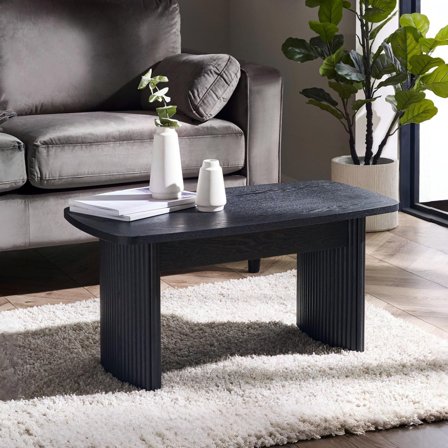 Transform your living space with the Louis Compact Coffee Table in Black, an exquisite fusion of modern design and opulent detailing. This sleek table boasts a luxurious matt black finish, infusing a sophisticated touch into your decor. The addition of fluted detail on two legs introduces a distinctive and stylish element, establishing a captivating focal point in your living room.