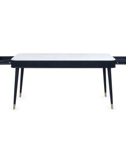 Elevate your dining space with the Louis Fluted Stone Top Dining Table which features exquisite craftsmanship and luxurious details. The white stone marble effect table exudes opulence complemented by sophisticated matt black ribbed edging. With convenient drawers, this table provides a seamless blend of style and storage – offering both form and practicality for memorable gatherings.