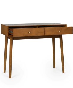 A retro-inspired style with a nostalgic feel, the Lowry Writing Desk will add a timeless look to any home office space. Constructed from an exquisite cherry ash wood veneer with beautifully tapered legs. Featuring 2 pull-out drawers complemented by golden framed knobs. Providing the perfect ample storage space for stationary essentials.