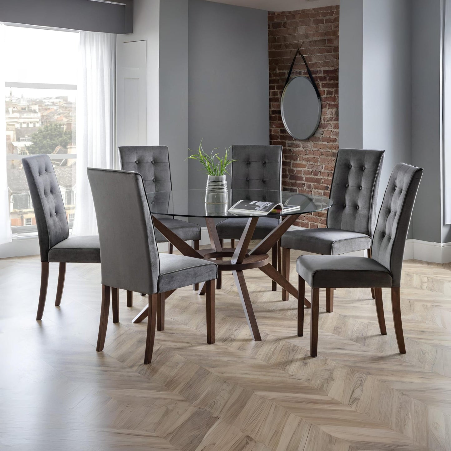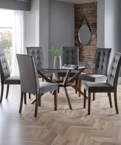 Upholstered in luxurious grey velvet, the Madrid dining chair adds a touch of class to any room. Featuring a high tufted back and walnut coloured legs, this dining chair is suitable for a variety of dining tables and décor.