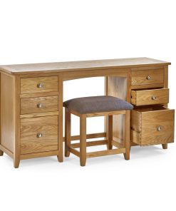 Crafted from solid oak and oak veneers this dressing table and stool set is the perfect addition to any bedroom space. Combining durability and style, with 6 generously sizes drawers providing copious amounts of storage space. Finished with round silver knobs and partnered with a comfortable and robust grey pad stool