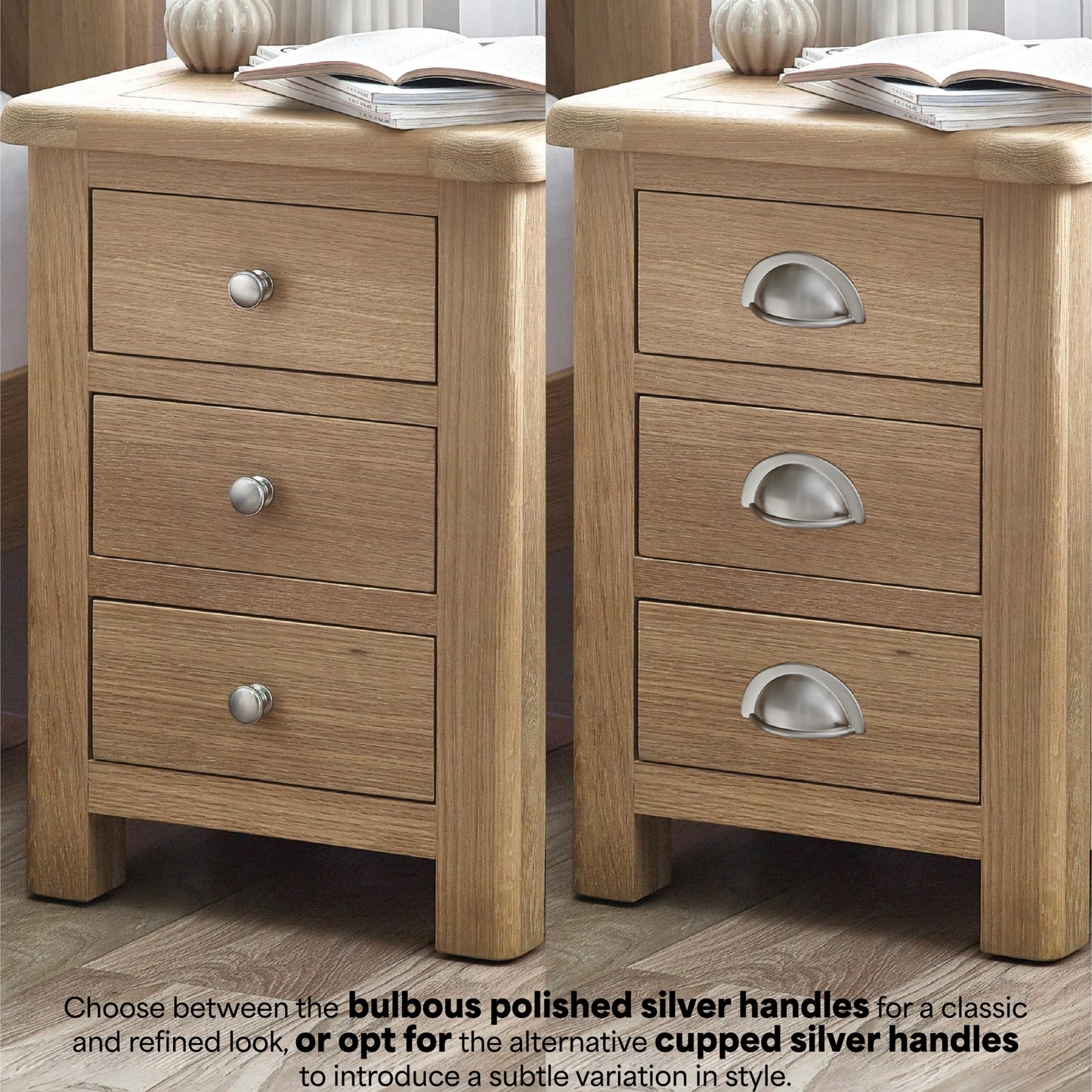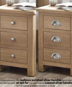 The Memphis 3 Drawer Bedside is finished in a gorgeous limed oak, providing a smooth curved edging that will add a timeless look to any bedroom space. This sleek design features three pull-out drawers offering storage space for key necessities at hand reach which are elegantly finished with bulbous polished silver handles.