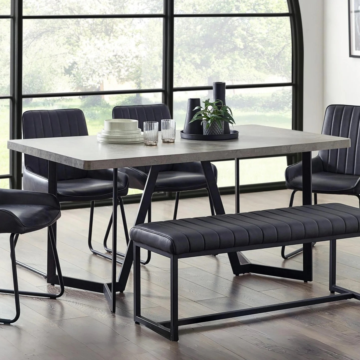 The Miller table has an industrial concrete effect top which makes a great addition to any dining space. The contrasting modern black legs have a beautiful shape – likely to spark conversation when hosting your dinner parties.