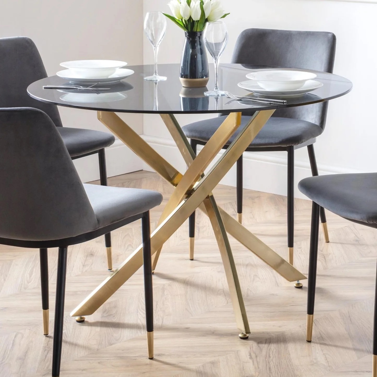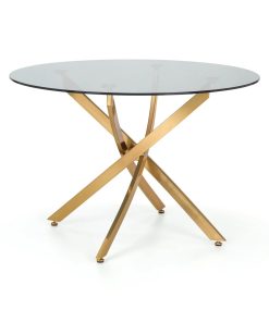 Montero is a strikingly elegant dining table which combines gold metal and glass to create a modern and stylish aesthetic. The intertwined legs leave a unique look which also provide a sturdy support for the table – making this a great, durable centre piece in any home.