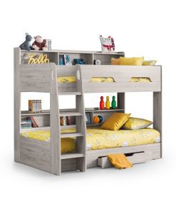 Orion is a contemporary, innovative bunk bed presented in an on-trend Grey Oak finish. Orion combines style with great practicality and includes a handy pull-out drawer and extensive shelving for kids’ books and toys, with a subtle raised lip to prevent anything slipping down the back. The lower bunk is positioned close to the ground, making it ideal for smaller children, while the robust ladder features attractive cut-out handles and optional glow-in-the dark strips on the steps for added safety. Due to Bunk Bed Safety Regulations, only the Premier or Platinum Mattresses are suitable for use on the upper bunk.