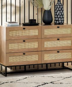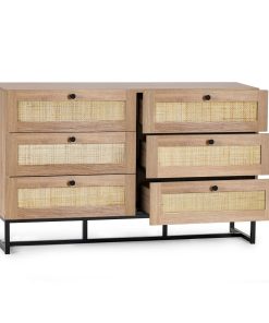 Fusing modern construction with retro design elements, the Padstow collection will exquisitely complement any styled home. The natural rattan fronts and industrial-style base collaborate perfectly to leave a warm yet chic aesthetic in your home. This range includes a bedside, 3 drawer chest, 6 drawer chest, wardrobe, coffee table, TV unit, sideboard, and tall bookcase. Also available in a black finish.