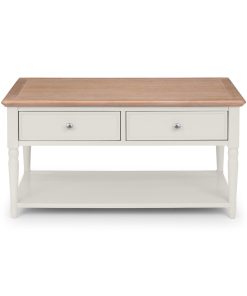 This timeless coffee table offers an authentic antique design with a classic turned leg detail perfect for contemporary spaces as well as traditional homes. Finished in a grey lacquer with a limed oak effect top, the Provence features additional storage with 2 drawers, perfect for storing coasters and magazines.