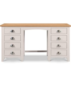 Finished in a elephant grey lacquer, the Richmond bedroom range is a timeless, elegant design suitable for a wide range of décor. Constructed from white oak and oak veneers, this lacquered bedroom range brings a modern twist on a traditional construction. Suitable for those with set morning routines, this twin pedestal dressing table offers a spacious surface as well as 8 drawers for your cosmetics.