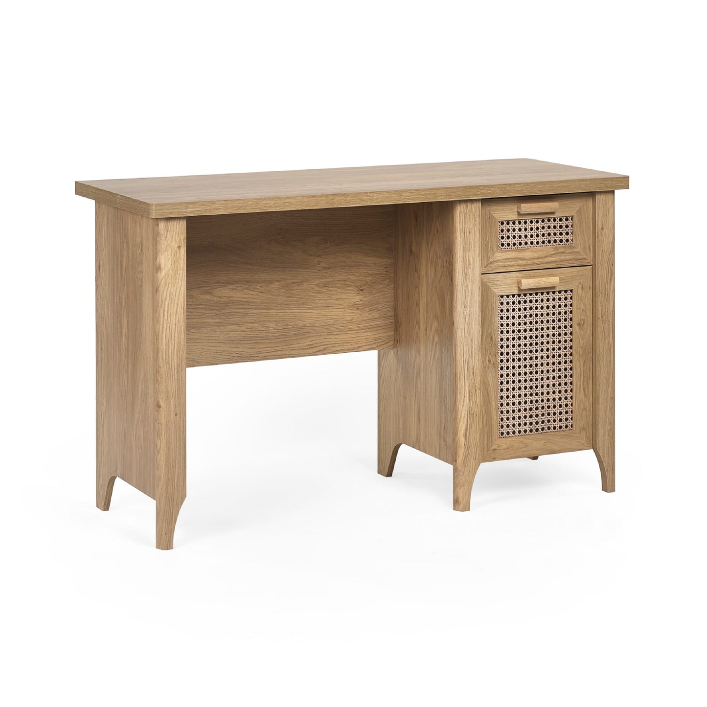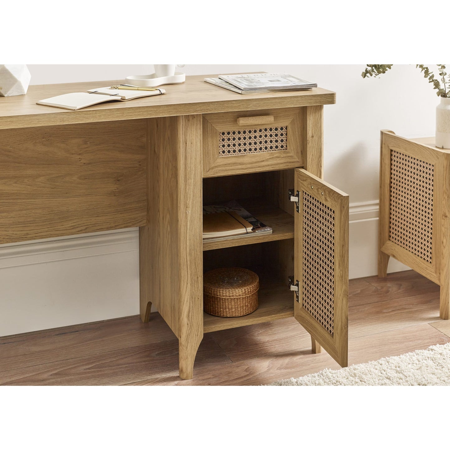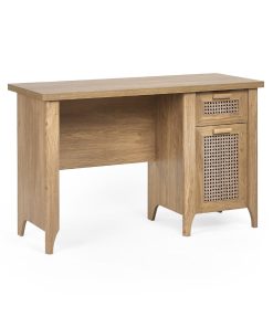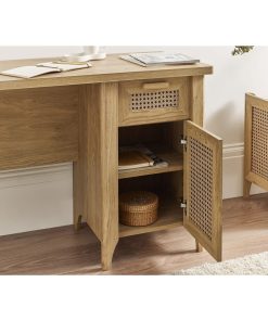 Showcasing a beautifully sleek design with a bohemian feel, the Sydney Desk offers exquisitely curved edging with gentle soft lines stunningly combined with a rattan-effect sticker front. Finished with a natural oak effect featuring one pull-out drawer and one cupboard providing the ideal storage space for stationary essentials. All around creating the perfect airy, warm feel within your home.