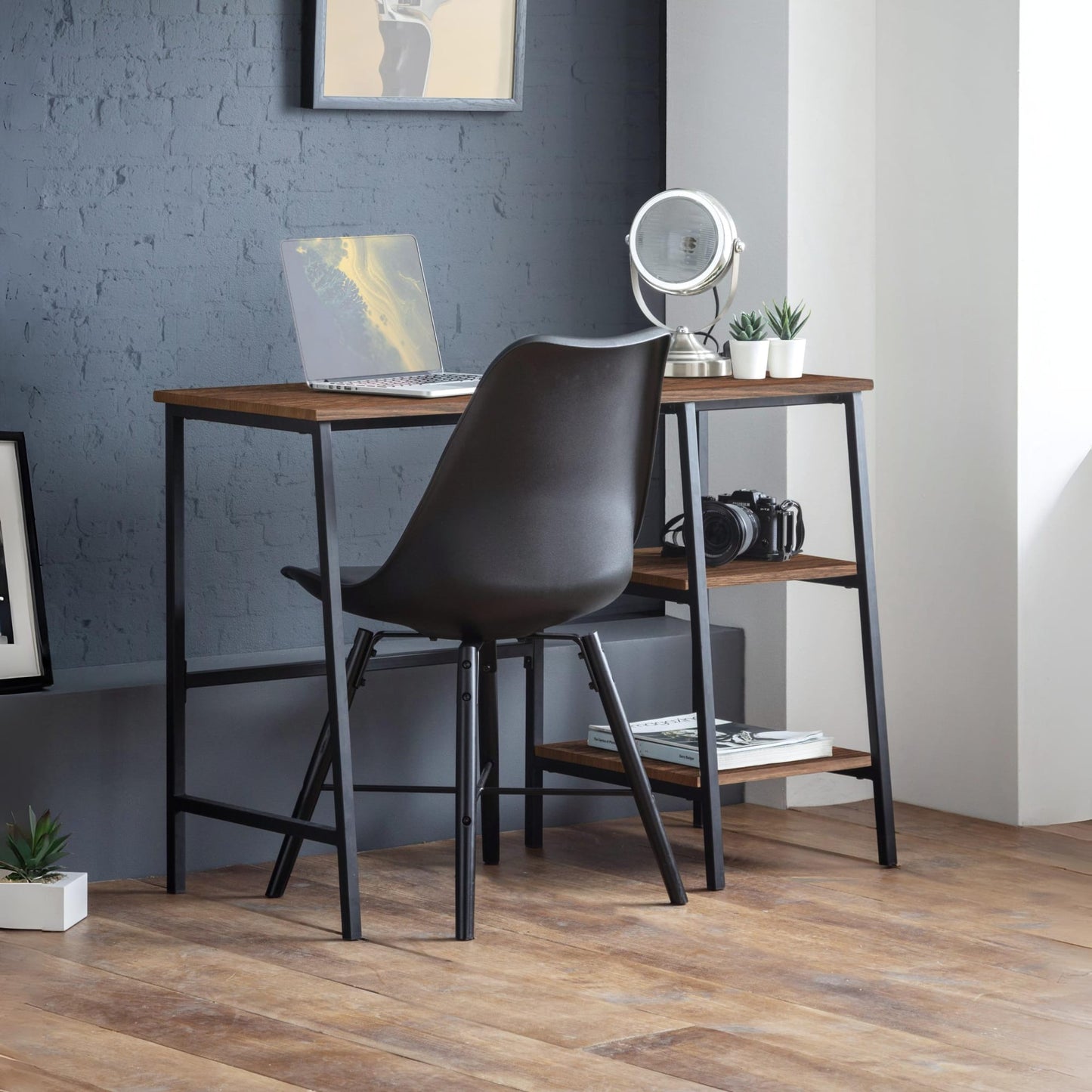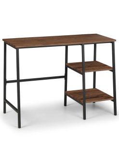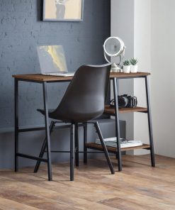 A cool, modern desk designed to add a contemporary touch to any living space. Its simple clean lines, delineated by a subtle, black coated metal frame are complemented perfectly by a warm, walnut foil, to create a very stylish and sleek product. This desk features 2 shelves on the right hand side, suitable for stationary storage.