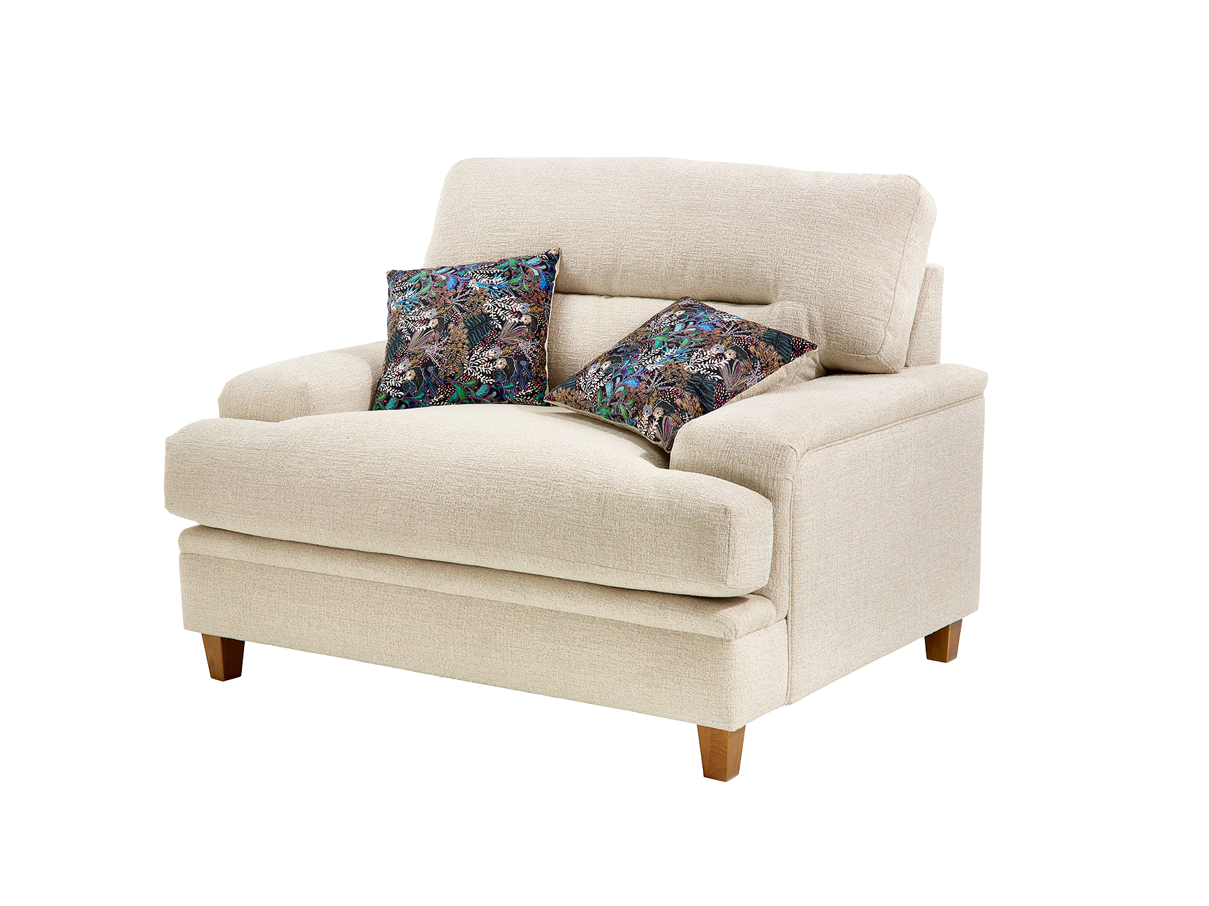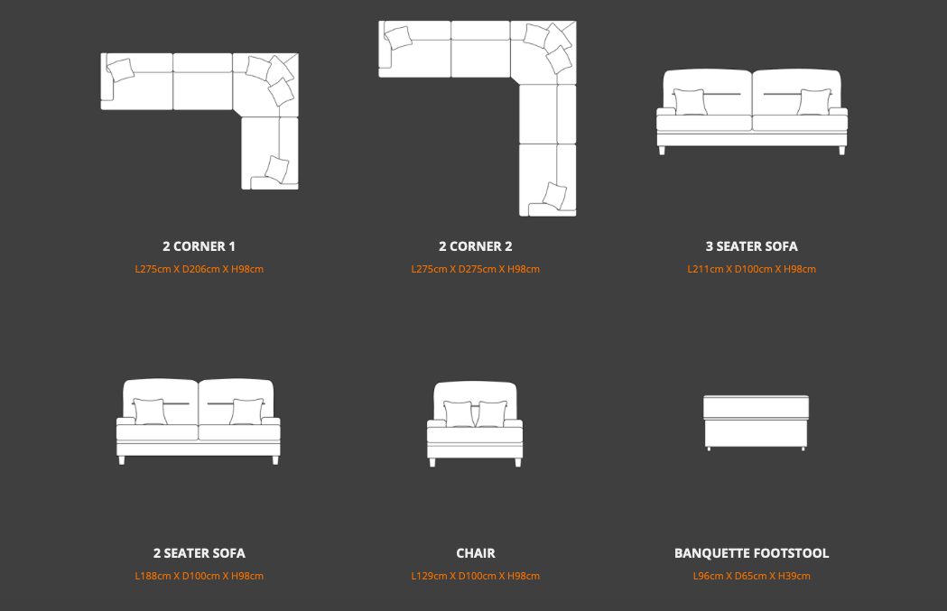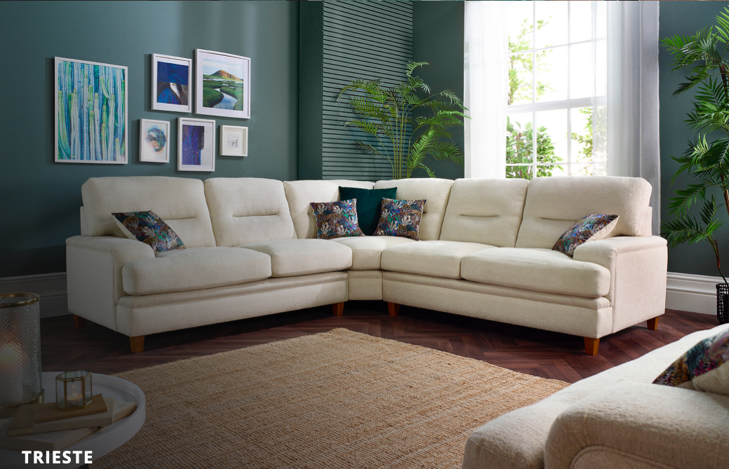 The Trieste collection is a contemporary design offering comfort and style, upholstered in a luxurious soft chenille. Wide arms and divided lumber gives the sitter superior support. The large corner allows the whole family to relax together, elegant printed velvet scatters add the finishing touch.