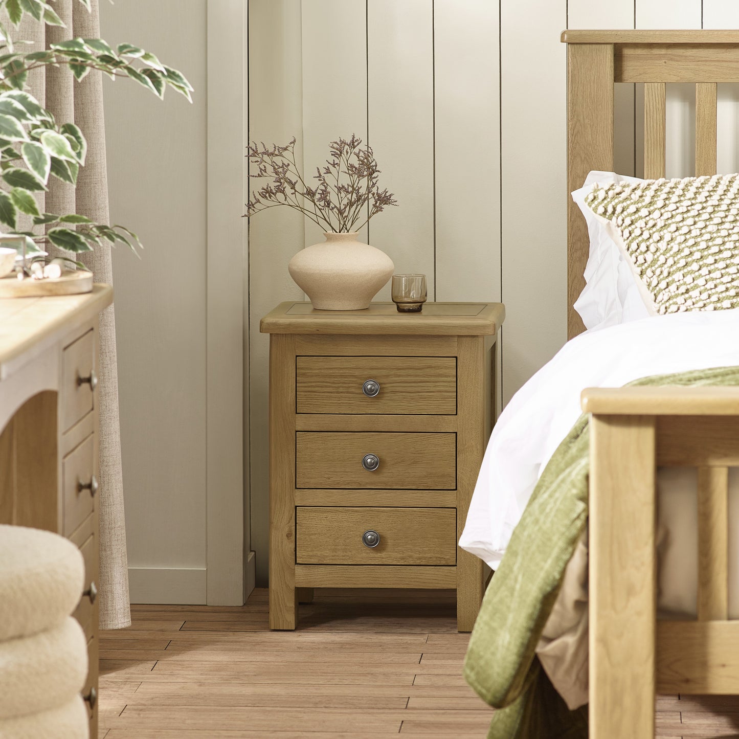 A compact yet characterful bedside piece designed to bring warmth, balance, and practicality to the bedroom. The Windsor Bedside Table is crafted from responsibly sourced oak and finished in a rich smokey oak tone, offering a refined storage solution with timeless appeal. Designed to complement the wider Windsor collection, it introduces texture, depth, and natural warmth beside the bed. Its solid proportions and softened detailing give it a reassuring presence, while its compact footprint makes it ideal for both spacious and smaller bedrooms.
