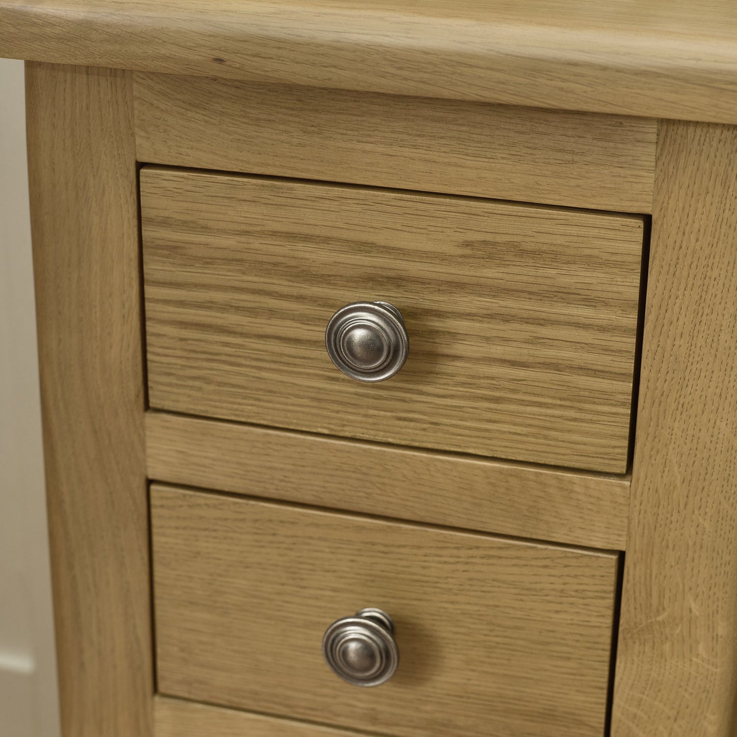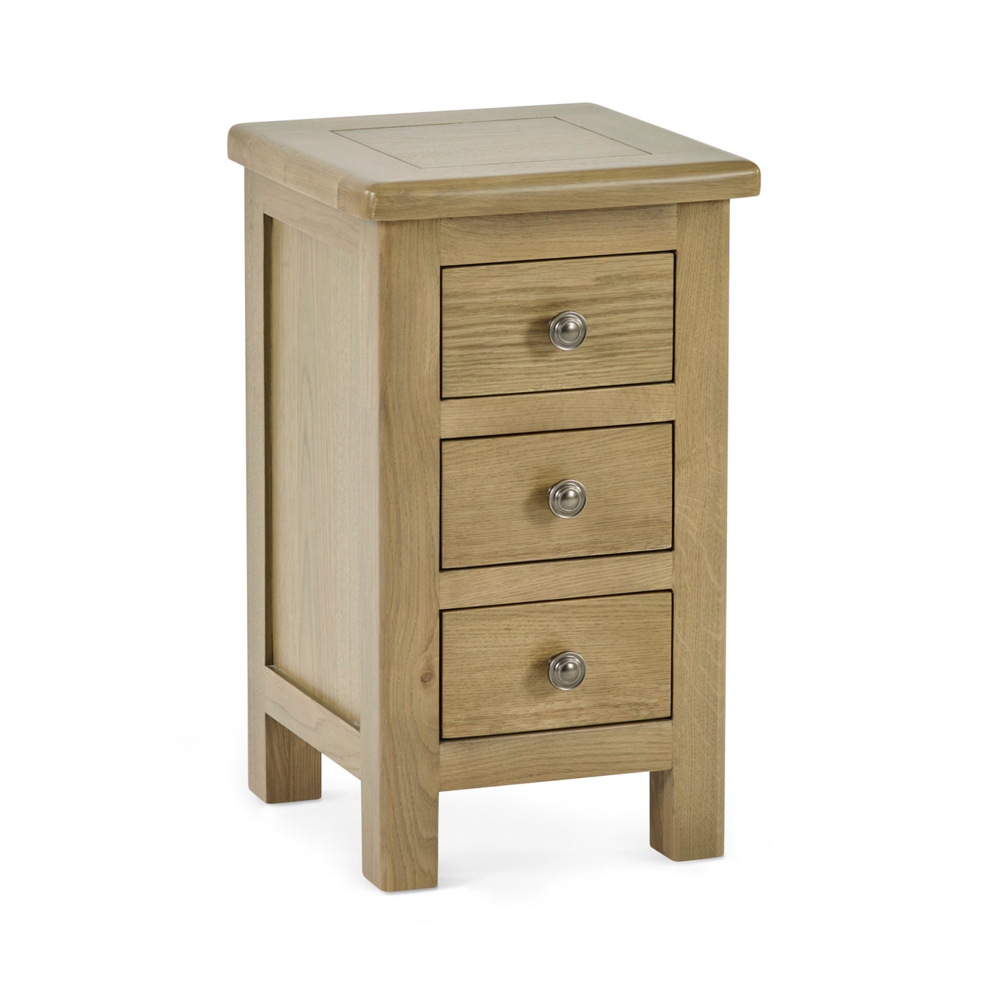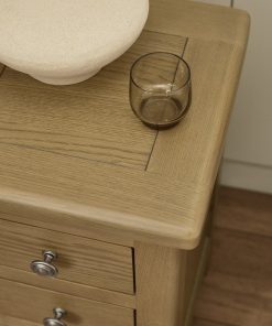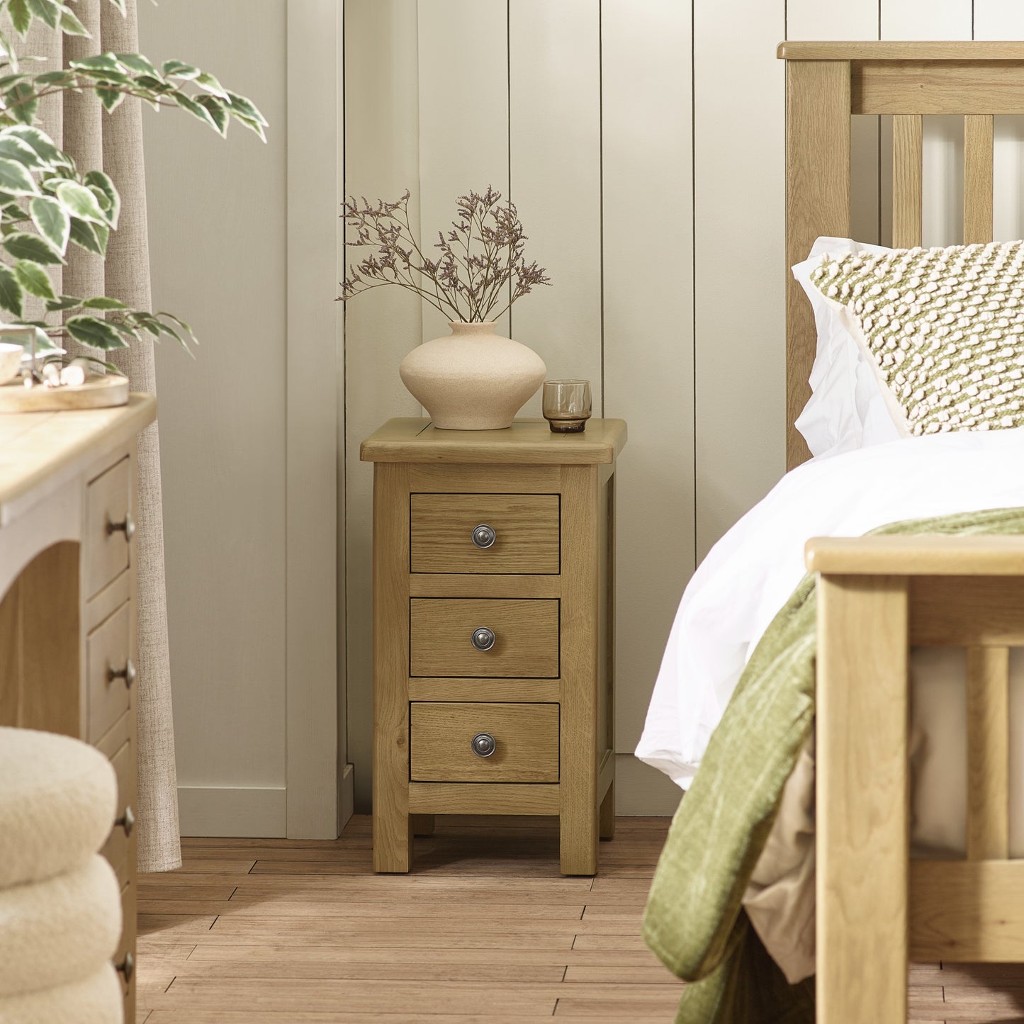 A slender yet generously practical bedside cabinet, designed to deliver storage without taking up space. The Windsor Slim 3 Drawer Bedside is crafted from responsibly sourced oak and finished in a warm, on-trend smokey oak tone. With its tall, narrow profile, it’s ideal for bedrooms where space is limited but storage is still essential. Combining elegant proportions with solid craftsmanship, it brings both function and refined style to the bedside.
